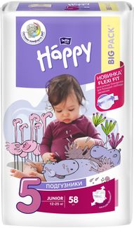 - Bella Baby Happy Junior 58 подгузников в пачке 12 25 кг по выгодной цене 1 490 р. руб.;