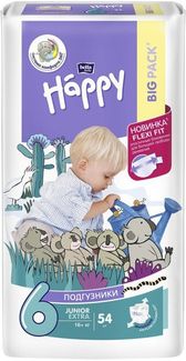 - Bella Baby Happy Junior Extra 54 подгузника в пачке от 16 кг по выгодной цене 1 490 р. руб.;