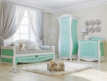 Детская МИРЭЛЬ-2 Тиффани полностью преобразит комнату вашего ребенка, сделав ее яркой и запоминающейся. Все предметы мебели, идущие в комплекте, оснащены каркасами с гнутыми боковинами, декоративными элементами и фасадами из МДФ с ручной росписью. Кровать оборудована ящиком для белья и комплектуется наматрасником и двумя декоративными валиками. В комплектацию вошли: