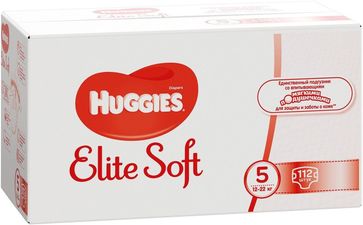 - Huggies Elite Soft 112 подгузников в пачке 12 22 кг по выгодной цене 5 290 р. руб.;