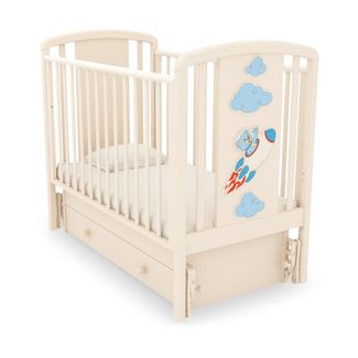 Кровать Angela Bella Жаклин мишка на ракете на универсальной маятнике для детей в возрасте от 0 до 3-х лет Характеристики: Производитель: Гандылян (Россия) Материал: ДСП, Массив бука, МДф Размер матраса в кроватку: 1200х600 мм Съемная боковина: да Количество уровней ложа: 2 Опускаемая боковина: да Силиконовые накладки: да Ящик для белья: да Тип качания кроватки: маятник универсальный Внешние габариты (ДхШхВ): 1260x700x1100 мм Цвет: белая ночь, белый, слоновая кость Минимальная сумма заказа 1000 рублей. Возможен самовывоз.