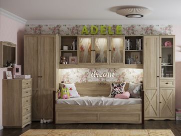 Коллекция для спальни ADELE расширила ряд модулей и фабрика создала легкую, нежную молодежную серию для маленьких принцесс в стиле Прованс, которая несет в себе особое очарование, ощущение гармонии и простоты, великолепие природы, полей душистой лаванды, необычайную легкость воздуха и игру солнечных бликов. Для коллекции подобран декор Дуб Сонома с текстурой натуральной древесины, с мягким и теплым оттенком, поэтому и зимой, и летом в такой светлой спальне будет уютно. Яркую индивидуальность диванчику-кровати ADELE придают толстые кроватные опоры (49 мм) и изящный вензельный рисунок на изголовье в тон кроватным опорам, выполненный УФ-печатью. Серию дополняют вместительные шкафы, которые позволят разместить в комнате весь гардероб принцессы. Глубина шкафов в молодежной серии 400 мм. Если Ваша комната позволяет расставить бОльшую глубину, предлагаем рассмотреть вариант шкафной группы из спальни, где глубина шкафов составляет 590 мм. Особенности серии ADELE: