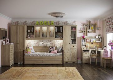 Коллекция для спальни ADELE расширила ряд модулей и фабрика создала легкую, нежную молодежную серию для маленьких принцесс в стиле Прованс, которая несет в себе особое очарование, ощущение гармонии и простоты, великолепие природы, полей душистой лаванды, необычайную легкость воздуха и игру солнечных бликов. Для коллекции подобран декор Дуб Сонома с текстурой натуральной древесины, с мягким и теплым оттенком, поэтому и зимой, и летом в такой светлой спальне будет уютно. Яркую индивидуальность диванчику-кровати ADELE придают толстые кроватные опоры (49 мм) и изящный вензельный рисунок на изголовье в тон кроватным опорам, выполненный УФ-печатью. Серию дополняют вместительные шкафы, которые позволят разместить в комнате весь гардероб принцессы. Глубина шкафов в молодежной серии 400 мм. Если Ваша комната позволяет расставить бОльшую глубину, предлагаем рассмотреть вариант шкафной группы из спальни, где глубина шкафов составляет 590 мм. Особенности серии ADELE: