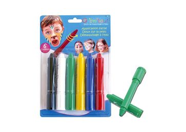 Для детей от 3-х лет. Гримерные карандаши на водной основе профессионального качества. Карнавал - это яркий праздник, море впечатлений и эмоций. В комплекте: 6 цветов (красный, желтый, синий, белый, черный, зеленый). Для снятия макияжа достаточно губки-спонжа и воды. С помощью гримерных карандашей Grimtout Вы сможете создать настоящий профессиональный макияж, который подойдет для любого случая - Масленицы, Новогоднего карнавала, Хэллоуина, Рождества, Дня Рождения, ярмарок, тематических вечеринок или школьных праздников... Вы можете использовать всю цветовую палитру Grimtout в соответствии с Вашими желаниями и темой Вашего костюма или вечеринки, будь то образ принцессы, ведьмы, кошки, пирата или любого другого героя. Гримерные карандаши Grimstick можно использовать отдельно или как дополнение к палитре для макияжа Grimtout профессионального качества. Аквагрим в виде карандаша очень удобно использовать для нанесения кривых линий, прорисовывания очков, усов кошки и другие рисунков, которые требуют немного ловкости. Гримерные карандаши можно использовать в качестве маркера. Они готовы к использованию - просто нужно снять защитный колпачок, повернуть основание и карандаш появится! Благодаря этому чень просто содержать гримерные карандаши Grimtout в чистоте и порядке. Мягкие и не содержащие жира косметические карандаши Grimtout смягчают и разглаживают кожу лица. Демакияж проводить очень просто - смойте карандаши водой и мылом, как и любые другие краски для лица Grimtout! Совет: гримерные карандаши очень удобно использовать с трафаретами для макияжа Grimtout. Вместе они создают возможность нанесения быстрого и интересного макияжа или временной татуировки. Почувствуйте себя художником и окажитесь в гримерной мастерской, чтобы развлечь своих детей! Они это полюбят ... и Вы тоже! Краски на водной основе Grimtout соответствуют всем требованиям по качеству, предъявляемым к средствам для косметического макияжа и