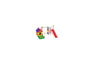 Игровые элементы:домик, песочница, лазы, горка пластиковая, качели