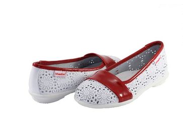 Изящные туфли из белоснежной перфорированной кожи с красным кантом. Гордость производителя - их можно стирать. Белая резиновая подошва без "почеркушек ценного школьного паркета". Особенность модели - на узкую ножку. Модель "дышит" - кожа ажурная None Возможен самовывоз. Есть доставка.