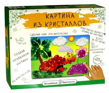 <p>Создайте чудесную объемную картину из кристаллов!</p> <p>Маленькому динозаврику нужны эффектные шипы, а мир вокруг него нуждается в ярких красках.</p> <p>С помощью набора для выращивания кристаллов "Динозавры" вы сможете провести настоящий эксперимент и вырастить кристаллы прямо на картонной основе.</p> <p>Вы увидите, как всего за несколько часов простая картинка преобразится до неузнаваемости.</p> <p>Следуя подробной инструкции на русском языке, соберите картину, установите ее на подставку и добавьте специальную жидкость в резервуары. Оставьте картину на 12 часов в сухом темном месте подальше от сквозняка. Ваша картина постепенно покроется настоящими пушистыми кристаллами. Для сохранности готовую поделку рекомендуется покрыть лаком.</p> <p>Упаковка: цветная картонная коробка<br />В комплекте: инструкция, картонная основа, декоративная цветная накладка, блистер-подставка, специальный раствор для выращивания кристаллов, подставка для картины, палочка, защитные перчатки<br />Информация на упаковке - полностью на русском языке</p> Наличные, безнал., карты, эл. деньги, юр. лица Возможен самовывоз. Есть доставка.