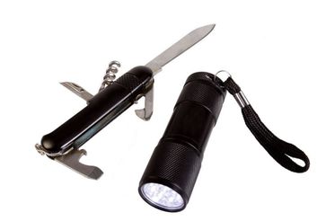 <p>В комплекте карманный нож с 5 функциями и фонарик 9 LED.<br /><br />Фонарик работает на батарейках типа ААА (3 шт.). В комплект не входят! Батарейки &laquo;Фотон&raquo; ААА и Duracell AAA можно приобрести дополнительно.<br /><br />Материал: пластик; металл<br /><br />Размер: 13х9х4,2 см<br /><br />Вес (грамм): 333.33</p> Наличные, безнал., карты, эл. деньги, юр. лица Возможен самовывоз. Есть доставка.