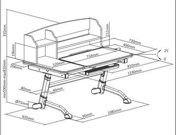 Размер парты: Ш: 1190 мм, Г: 730 мм, В: 945-1165 мм Размер наклонной части столешницы (ШхГ): 810x490 мм Высота стола регулируется: от 590 до 810 мм Толщина столешницы: 25 мм Угол наклона столешницы: 0-25° Столешница: Е1 доска с меламиновым покрытием + ПВХ Ножки: металлокаркас белого цвета