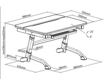 Размер парты: Ш:980 мм, Г: 705 мм, В: 590-810 мм Размер наклонной части столешницы (ШхГ): 980x500 мм Высота стола регулируется: от 590 до 810 мм Толщина столешницы: 25 мм Угол наклона столешницы: 0-25° Столешница: Е1 доска с меламиновым покрытием + ПВХ Ножки: металлокаркас белого цвета