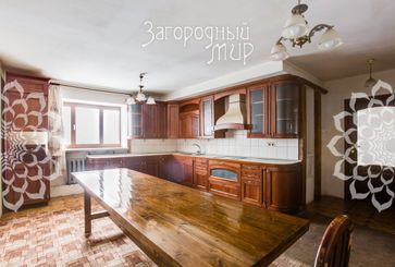 На первом этаже в основной части дома разместилась просторная кухня с гарнитуром из массива дуба, варочной панелью ZANUSSI, 2 спальни, санузел и кабинет с камином. К дому пристроен гараж со смотровой ямой.