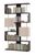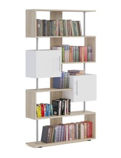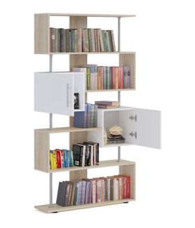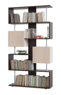 Широкий стеллаж многофункционального назначения. Модель имеет большое количество открытых полочек и два закрытых шкафчика. Необычная геометрия привлекает внимание благодаря металлическим стоевым между полками, которые придают легкость конструкции. Высота больших и средних отделений — 340 ммШирина больших отделений — 988 ммШирина средних отделений — 592 ммРазмеры «окошек» (ВхШ) — 328 х 364 мм Стеллаж рекомендуется крепить к стене для устойчивости. Вся необходимая фурнитура входит в комплект. Изделие выполняется из ЛДСП толщиной 16 мм, края обработаны кромкой 0,4 мм. Металлические опоры — хромированная труба диаметром 340 и 168 мм.
