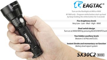 Как и другие фонари Eagletac он рассчитан на огромные нагрузки, сверх-надежен, долговечен и обладает высоким КПД. SX30C2 NW работает и от батарей CR123A, и от аккумуляторов 18650, к нему подходит удлинитель корпуса фонаря EagTac G25C2 на 1 х 18650. ЕагТак SX30C2 NW снабжен удобной системой управления двумя кнопками. При этом, под белой боковой кнопкой фонаря находится светодиод, выполняющий функцию индикатора уровня заряда. Он мигает гол