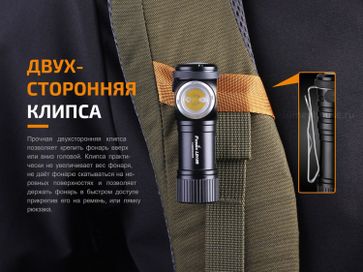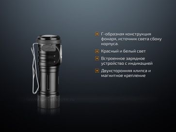 Как мы видим Fenix LD15R очень похож на Феникс HM50R, но в отличии от предшественника не имеет, в комплекте, налобного крепления! Зато светодиодный, «Г» образный фонарик обзавелся красными диодами, стальной клипсой и встроенным торцевым магнитом.