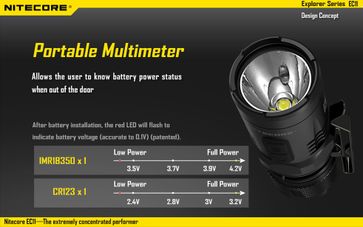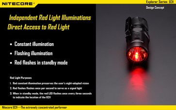 Новый фонарь NiteCore EC11 прежде всего имеет небольшие рамеры фонаря на каждый день и прекрасно подходит для туристов, рыбаков и охотников. Корпус EC11 выполнен из авиационного алюминиевого сплава, защищенным от воды (IPX 8) и ударов с анодированием категории (H III). В алюминиевом отражателе установлен светодиод CREE XM-L2 U2, а така же дополнительный красный светодиод. Они закрыты минеральным, закаленным, ударопрочным стеклом с антибликовым покрытием. Это позволяет светить фонарю белым светом на дистанцию равную 190 метрам. Красный светодиод используется так же и как индикатор питания. В издлии используется новейшая запатентованная микросхема, высокая эффективность которой обеспечивает непрерывную работу в течении 20 часов. Работает NiteCore на одном аккумуляторе 16340 ( RCR123 ) или батарейке CR123A.На изделии, ближе к головной части установлены две кнопки. Одна из них отвечает за включение-выключение изделия, вторая - за смену режимов яркости.На EC11 крепится съемная клипса, которую можно установить в двух разных положениях. None