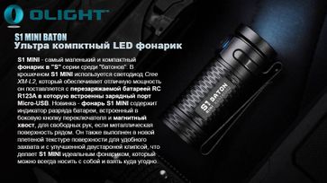 Светодиодный фонарик Olight S1 Mini, является глубоким рестайлингом легендарного фонаря Everyday carry Олайт S1 Baton. Он стал еще компактнее и еще ярче!