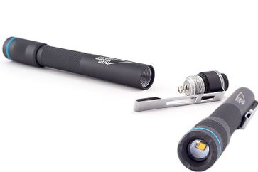 Специализированный фонарь Яркий Луч Medical выполнен стилизованнм под шариковую ручку, этот дизайн фонаря пришелся по вкусу многим офицерам вооруженных сил, для подсветки карт и документов и безусловно подходит врачам в их профессиональной деятельности. Корпус изделия выполнен из анодированного алюминия, он крепится к одежде с помощью стальной клипсы, а дизайн в фонаря-ручки максимально упрощает ношение и использование данного изделия. Его габариты и легкие элементы питания AAA (батарееки или аккумуляторы) позволяют носить фонарик с собой постоянно, совершенно не чувствуя вес. Максимальная яркость составляет 100 люмен, этого вполне достаточно для медосмотра, поскольку изменяемая фокусировка луча позволяет настроить необходимое освещение отдельныных полостей в пределах головы - носоглотку и ушшей. Минимальный режим – 5 люмен может использоватся для проверки зрачка на реакцию и осмотра сетчатки глаза, поскольку безопасен для зрения.
