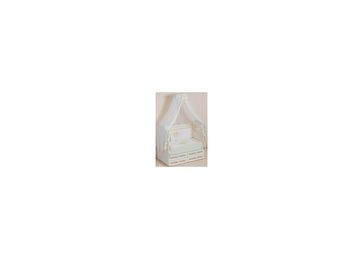 В комплекте 7предметов. 1.Одеяло – 110х140 - (бязь — хлопок 100%; наполнитель - холлофайбер) 2.Подушка – 40х60 - (бязь — хлопок 100%; наполнитель - холлофайбер) 3.Бампер – раздельный 4 части (360 см) - (сатин — хлопок 100%; наполнитель - холлофайбер) 4.Балдахин - тюль (сетка) с отделкой из ткани сатин – (стандарт 500х170) 5.Пододеяльник – 112х142 - (сатин — хлопок 100 %) 6.Простынка с резинкой