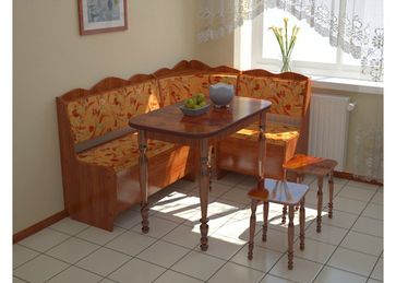 Кухонный уголок на резных ножках «Мария-2». Размер дивана 1500х1000 мм. Диван делается из ЛДСП 16 мм. Кухонный уголок можно собрать на правую, либо на левую стороны. Есть дополнительное пространство под мягкой частью (сиденья откидываются). Цвет дерева: ольха. Обивка: флок и кожзам.