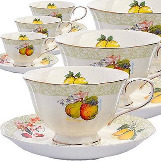 Чайный набор на 6 персон изготовлен из качественного фарфора и декорирован нежным рисунком с изображением фруктов. Элегантный чайный набор не только украсит сервировку стола, но и поднимет настроение и превратит процесс чаепития в одно удовольствие. Набор состоит из 12 предметов: 6-ти чашек и 6-ти блюдец, упакованных в круглую подарочную коробку. Чашки имеют удобные, изящные ручки. Изделия легко и просто мыть. Чайный набор прекрасно подойдет в качестве подарка для родных и друзей на любой праздник! К красивому чайному набору подберите скатерть, столовые приборы и Вы создадите приятную атмосферу праздничного стола. None Есть доставка.