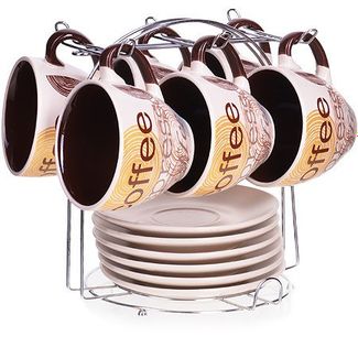 Чайный набор состоит из 6 чашек, 6 блюдец и металлической подставки. Предметы набора изготовлены из высококачественной керамики в коричневых тонах и оформлены стильным рисунком "Кофе". Элегантный дизайн придется по вкусу и ценителям классики, и тем, кто предпочитает утонченность и изысканность. Он настроит на позитивный лад и подарит хорошее настроение с самого утра. Чайный набор идеально подойдет для сервировки стола и станет отличным подарком к любому празднику. Изделия можно компактно хранить на подставке, входящей в набор. Подходит для мытья в посудомоечной машине. None Есть доставка.
