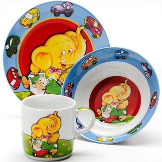 Предметы набора выполнены из высококачественной керамики и декорированы красочным рисунком. Изделия легкие и функциональные. Такой набор обязательно понравится вашему ребенку, потому что теперь у него будет своя собственная посуда с ярким и оригинальным детским рисунком. Набор посуды для детей включает в себя три предмета: суповую тарелку, обеденную тарелку и кружку. Набор упакован в красочную, подарочную упаковку. Подходит для мытья в посудомоечной машине. Для детей от 3-х лет. None Есть доставка.