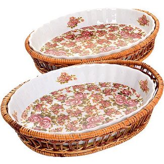 Набор овальных форм MAYER&BOCH выполнен из качественного фарфора белого цвета. Поверхность украшена изображением цветов. К каждой форме прилагается плетеная корзинка из ротанга, выполняющая роль оригинальной подставки. Формы прекрасно подойдут для запекания овощей, мяса и других блюд, а благодаря своему оригинальному дизайну, они, несомненно, украсят ваш стол. Посуда не впитывает посторонние запахи, не имеет труднодоступных выступов или изгибов, которые накапливают грязь, и легко чистится. Фарфор выдерживает высокие перепады температуры, поэтому такие формы можно использовать в духовке, микроволновой печи, а также для хранения пищи в холодильнике. Подходит для мытья в посудомоечной машине. В комплекте: 2 формы, 2 плетеные корзинки. None Есть доставка.