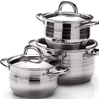Набор кастрюль MAYER&BOCH выполнен из высококачественной многослойной нержавеющей стали с комбинированной полировкой. Толщина стенок 4 мм. Этот набор посуды предназначен для здорового и экологичного приготовления пищи. Кастрюли имеют многослойное капсульное дно с алюминиевым основанием, которое быстро и равномерно накапливает тепло и также равномерно передает его пище. Внутренняя поверхность идеально ровная, что значительно облегчает мытье. Крышки, выполненные из термостойкого стекла, имеют отверстие паровыпуска и металлический обод. Крышки плотно прилегают к краям посуды, предотвращая проливание жидкости и сохраняя аромат блюд. Также изделия снабжены эргономичными ручками из стали. В комплекте 6 предметов: 3 кастрюли, 3 стеклянные крышки. Подходит для использования на всех типах плит, включая индукционные. Подходит для мытья в посудомоечной машине. None Есть доставка.