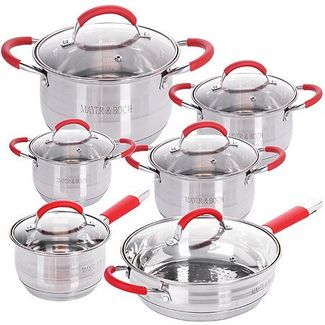 Набор посуды MAYER&BOCH изготовлен из высококачественной нержавеющей стали с толщиной стенок 0,4 мм и усиленным индукционным дном. Этот набор кастрюль предназначен для здорового и экологичного приготовления пищи, качественная сталь обеспечит быстрый нагрев продуктов и надолго сохранит тепло, а возможность готовки с небольшим количеством воды позволит сохранить максимальное количество полезных веществ, витаминов и минералов. Изделия снабжены крышками из термостойкого стекла с паровыпуском и металлическим ободом, а также удобными не нагревающимися стальными ручками с красными силиконовыми накладками. Рельефная внутренняя поверхность дна сковороды позволит жарить продукты без масла или с минимальным его количеством. Внешняя поверхность посуды гладкая с зеркальной полировкой и гравировкой в форме колец. Изделия легко и просто моются. В комплекте 12 предметов: 4 кастрюли с крышками, 1 сотейник с крышкой, 1 сковорода с крышкой. Подходит для использования на всех типах плит, включая индукционные. Подходит для мытья в посудомоечной машине. None Есть доставка.