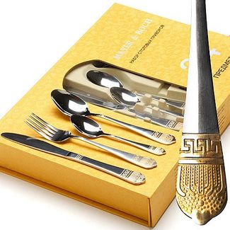 Набор столовых приборов MAYER&BOCH на 6 персон выполнен из высококачественной нержавеющей стали, ручки приборов имеют глянцевую полировку и декорированы изящным золотым орнаментом. Набор из 24-х предметов включает в себя: 6 столовых ложек, 6 вилок, 6 ножей и 6 чайных ложек. Благодаря качественной полировке, изделия сохраняют прекрасный внешний вид на долгое время. Набор обладает не только оригинальным дизайном, но и практичностью, так как изделия из качественной нержавеющей стали имеют высокую прочность, устойчивость к коррозии, кроме того, нержавеющая сталь экологична, она не меняет вкусовые свойства еды, потому как не вступает в реакцию с ее компонентами. Упакованный в красочную подарочную коробку такой набор безусловно станет прекрасным подарком для любой хозяйки и украсит ваш праздничный стол. Подходит для мытья в посудомоечной машине. None Есть доставка.