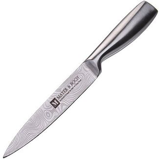 Нож MAYER&BOCH изготовлен из высококачественной дамасской стали, обеспечивающей высокие режущие свойства кромки клинка. Нож имеет острое лезвие с ровной поверхностью и выверенным углом заточки, а также имеет специальную закалку металла для повышения прочности. Поверхность клинка легко моется, не впитывает и не «передает» запахи пищи при нарезке продуктов. Этот нож идеально подойдет для нарезки крупных твердых овощей и фруктов, разделки курицы, крупной рыбы или мяса, широкой боковой стороной лезвия удобно давить чеснок. Тщательно разработанный дизайн рукоятки и ее качество, позволяют ножу удобно располагаться в руке. Нож изготовлен из экологически чистых материалов, легок и прост в эксплуатации и уходе. None Есть доставка.