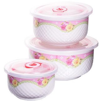 Набор салатниц с крышками LORAINE выполнен из керамики. Гибкая крышка сделана из пластика. Набор состоит из 3-х салатниц разного размера. Изделия декорированы орнаментом и рисунком, сочетая в себе классический дизайн с максимальной функциональностью. Удобная крышка из пищевого пластика позволит дольше храниться приготовленным блюдам. Такой набор послужит отличным подарком к любому празднику, а также добавит элегантности и уюта любому праздничному столу! Посуда обладает гладкой непористой поверхностью, не впитывает запахи, легко моется. Подходит для мытья в посудомоечной машине. None Есть доставка.