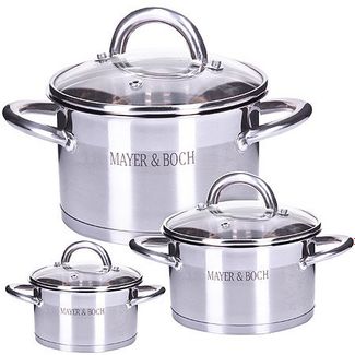 Набор кастрюль MAYER&BOCH выполненных из нержавеющей стали, состоит из кастрюль разного объема с крышками. Это материал, из которого в течение нескольких десятилетий во всем мире производятся столовые приборы, кухонные инструменты и различные аксессуары. Этот материал обладает высокой стойкостью к коррозии и кислотам. Прочность, долговечность и надежность этого материала, а также первоклассная обработка обеспечивают практически неограниченный запас прочности. Кастрюли имеют многослойное капсульное дно с алюминиевым основанием, которое быстро и равномерно накапливает тепло и также равномерно передает его пище. Такое дно позволяет готовить блюда с минимальным количеством воды и жира, сохраняя при этом вкусовые и питательные свойства продуктов. Применение технологии многослойного дна создает эффект удержания тепла - пища готовится и после отключения плиты благодаря термоаккумулирующим свойствам посуды. Диаметры изделий соответствуют общепринятым размерам конфорок бытовых плит. Кастрюли оснащены удобными металлическими ручками, которые не нагреваются в процессе приготовления пищи. Крышки изготовлены из жаростойкого стекла, оснащены ручками, отверстиями для выпуска пара и металлическим ободом. Можно использовать на газовых, электрических, галогенных, стеклокерамических, индукционных плитах. Можно мыть в посудомоечной машине. None Есть доставка.
