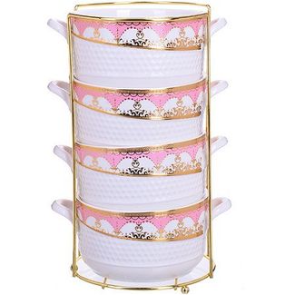 Набор из 4-х супниц LORAINE выполнен из высококачественного фарфора и украшен декоративным рисунком. Супницы компактно располагаются на оригинальной подставке из нержавеющей стали и не занимают много места при хранении. В фарфоровой посуде блюда сохраняют свои вкусовые качества, кроме того она обладает термической и химической прочностью. Благодаря оригинальному дизайну, такие супницы отлично подойдут как для ежедневного использования, так и для праздничной сервировки стола. Изделия оснащены двумя удобными ручками. В наборе: 4 супницы, 1 подставка. Подходит для мытья в посудомоечной машине. None Есть доставка.