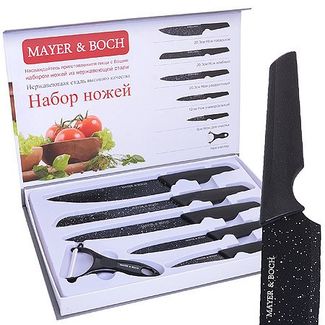 Набор ножей MAYER&BOCH состоит из 6-ти предметов. В наборе нож для очистки, поварской, хлебный, разделочный, универсальный и нож-пиллер. Все они разных размеров с лезвиями из высококачественной нержавеющей стали станет незаменимым помощником на Вашей кухне. Ножи идеально подойдут для резки как мяса и рыбы, так и сыра, фруктов и овощей. Эргономичная рукоятка каждого изделия удобно ложится в ладонь, обеспечивая безопасную работу, комфортное положение в руке, надежный захват и не дает ножам скользить при использовании. Поверхность клинков не впитывает и не «передает» запахи пищи при параллельной нарезке различных продуктов. Не подходит для мытья в посудомоечной машине. Мыть руками в теплой воде, используя моющее средство умеренной концентрации, затем ополоснуть и вытереть насухо. При необходимости ножи рекомендуется точить. Оригинальный дизайн набора и качество исполнения не оставят Вас равнодушными! None Есть доставка.