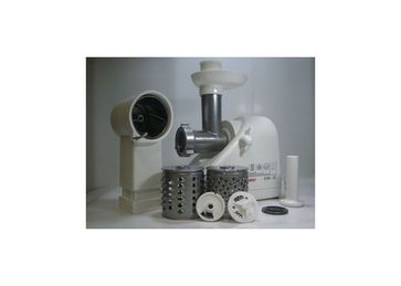 Две решётки обеспечивают желаемую консистенцию фарша,специальная насадка для набивки колбас,насадка для профилирования теста,три барабана для шнекования,нарезки и истирания овощей и фруктов, подставка для хранения насадок.Максимальная мощность 400 Вт.Номинальная мощность 220 Вт. электронная защита двигателя, четыре сменных барабана для шинкования, истирания, крупной и мелкой нарезки овощей и фруктов, три сменных решетки для приготовления фарша и рубки мяса, насадка для профилирования теста и получения из теста труьочек, отсек для намотки сетевого шнура, встроенный отсек для хранения насадок. None
