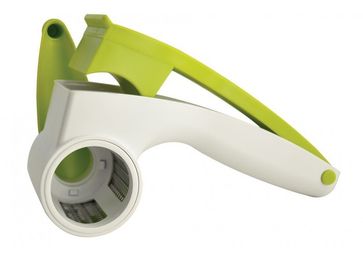 Терка роторная, материал: пищевой пластик, ручка - давилка, диск с лезвиями из стали, цвет: белый с салатовым None