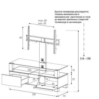 Надежная стойка под большие телевизоры с универсальным поворотным креплением из закаленного стекла с закругленными углами и полированной кромкой. Поворотное крепление подходит для всех видов плоских телевизоров (LCD, LED и плазма) и имеет возможность регулировки высоты. В задней ножке расположен кабель-канал для маскировки проводов и кабелей. Оснащена скрытой роликовой системой для плавного перемещения ТВ стойки вместе с телевизором и другой аппаратурой. Стойка предназначена для телевизоров с диагональю 32-75 дюймов (весом до 50 кг). Крепление поддерживает форматы 20x20, 30x30, 40x40. Возможно оснащение увеличенным креплением (80x45). Выдвижной ящик оснащен системой мягкого и бесшумного закрытия. Характеристики: Габариты (ШxВxГ, мм): 1200х1300х440 Закаленное стекло: да Цвет стекла: прозрачный Цвет ножек: стальной Нагр. на кронштейн (кг): 50 Нагр. верхняя полка (кг): 40 Диагональ ТВ (дюймы): 32-75 Кабель-канал: да Поворот кронштейна: да Скрытые колесики: да Цвет ящиков: белый Минимальная сумма заказа 1000 рублей. Возможен самовывоз.