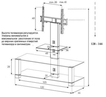 Надежная стойка под большие телевизоры с универсальным поворотным креплением из закаленного стекла с закругленными углами и полированной кромкой. Поворотное крепление подходит для всех видов плоских телевизоров (LCD, LED и плазма) и имеет возможность регулировки высоты. В задней ножке расположен кабель-канал для маскировки проводов и кабелей. Оснащена скрытой роликовой системой для плавного перемещения ТВ стойки вместе с телевизором и другой аппаратурой. Стойка предназначена для телевизоров с диагональю 42-65 дюймов (весом до 50 кг). Крепление поддерживает форматы 20x20, 30x30, 40x40. Возможно оснащение увеличенным креплением (80x45). Характеристики: Габариты (ШxВxГ, мм): 1200х1210х440 Закаленное стекло: да Цвет стекла: черный Цвет ножек: стальной MAX нагрузка (кг): 50 Нагр. верхняя полка (кг): 40 Нагр. нижняя полка (кг): 25 Диагональ ТВ (дюймы): 32-65 Кабель-канал: есть Поворот кронштейна: есть Скрытые колесики: да Минимальная сумма заказа 1000 рублей. Возможен самовывоз.
