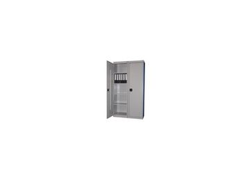 Шкаф архивно-хозяйственный металлический. Две секции в каждой по четыре регулируемые полки, в каждой секции замок ригельный с ручкой . Шкаф окрашен порошковой краской светло-серого цвета RAL7035 None