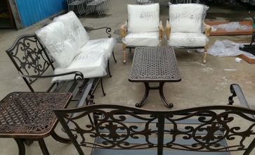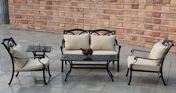 Комплект садовой мебели из литого алюминия Venice состоит из 2-х местного дивана, 2-х кресел, кофейного и журнального столиков. Материалы: литой алюминий Размеры (ШхВхГ), мм: диван: 1370х820х759 кресло: 770х820х759 журнальный столик: 560х520х560 кофейный столик: 1100х480х540 Цвет: античная бронза; подушки - белые Минимальная сумма заказа 1000 рублей. Возможен самовывоз.