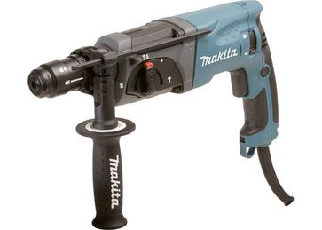 Надежный в эксплуатации перфоратор для работы по дереву, металлу, бетону, пластику и кирпичу, Makita HR2470FT, работает в трех режимах – сверление, сверление с ударом и долбление. Переключение режимов работы выполняется при помощи рукоятки на левой стороне корпуса, которую легко можно достать свободной рукой. Кнопка сбоку курка отвечает за блокировку включения перфоратора. В комплекте с перфоратором идет легкозаменяемый быстрозажимной патрон. Замена стандартного патрона SDS-Plus на трехкулачковый происходит в течение несколько секунд. Патрон SDS-Plus способствует быстрой замене оснастки. Конструкцией предусмотрено 40 возможных угловых позиций рабочей насадки, для наиболее эффективной работы в различных положениях.Специальная расцепная муфта предотвращает рывок при заклинивании бура и предохраняет механизм от износа. На холостом ходу перфоратора вибрация отсутствует. Благодаря мощному, 780-ваттному двигателю и хорошей частоте ударов – до 4500 в минуту, модель имеет отличную производительность. Электронная регулировка скорости вращения управляется усилием нажатия на пусковую кнопку. Функция реверса включается рычажком над курком, который можно легко достать указательным пальцем, не меняя положения руки на рукоятке. Реверс помогает извлечь заклинивший бур, и дает возможность использовать перфоратор в качестве шуруповерта, применяя соответствующую оснастку.Вес инструмента - 2,8 кг. Перфоратор отлично сбалансирован и удобно лежит в руке. Резиновые накладки на рукоятки препятствуют скольжению ладони. Дополнительная боковая рукоятка (в комплекте) помогает удерживать инструмент при продолжительной работе. Энергия удара перфоратора равняется 2,7 Дж. Максимальная частота оборотов на холостом ходу – 1100 в минуту. С перфоратором Макита HR 2470 FT можно использовать оснастку с максимальным диаметром коронки 65 мм. Максимальный диаметр сверления в дереве равняется 32 мм, в металле – 13 мм, а в бетоне – 24 мм.В комплект поставки перфо