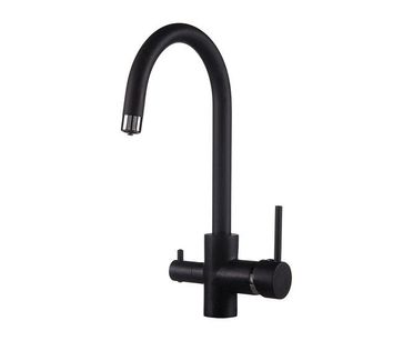 Корпус смесителя изготовлен из высококачественной латуни, а сверху обработан хромовым покрытием, окрашенным в черный цвет Комплект поставки, помимо корпуса смесителя, состоит из пластикового аэратора с функцией легкой очистки, керамического картриджа диаметром тридцать пять миллиметров, керамической вентильной головки, трех гибких шланга длиной тридцать пять сантиметров каждый (для горячей, холодной и питьевой воды), комплекта крепежных частей, переходного устройства для подключения шланг от фильтра с питьевой водой, металлические рукоятки для управления смесителем.