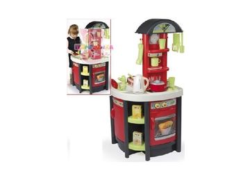 Кухня выполнена из упрочненного пластика, надежна и устойчива, также подходит для коллективной игры. Стильно подобранная цветовая гамма - красный, черный и белый. Акценты салатового цвета - полочки и посуда. Компактный кухонный комплекс: 2-х комфорочная плита (одна конфорка со звуком, вторая - наклейка), 3 треугольные полочки (2 маленькие и одна большая), мойка с краном (декоративный), духовка (дверка с наклейкой), холодильник (дверка с наклейкой), кофемашина (наклейки на полочках), микроволновая печь и полочки с продуктами (большая картонная деталь на обратной стороне стойки), вытяжка (наклейка), крючочки для развешивания кухонных принадлежностей и телефона,включение звуковых эффектов - просто поставить кастрюлю на конфорку, сразу раздается звук кипения. Чайник в фирменном стиле miniTEFAL: крышечка чайника открывается, совсем как у настоящего. Увлекательная игра развивает фантазию и воображение, а набор аксессуаров оптимален для знакомства с элементами домашнего хозяйства. Батарейки 2хАА (в комплект не входят). Материал упрочненная пластмасса. Размер игрушки: 61х37х99 см. Размер упаковки: 52х26х61 см. SMOBY, производство Франция. None Есть доста