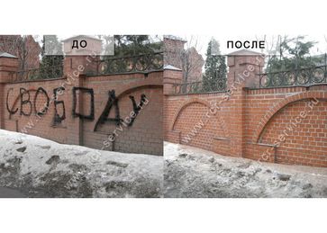 Очистка и удаление граффити с фасадов зданий при помощи технологии мягкий бластинг. Удаление краски для граффити с кирпича, дерева, металла, гранита, бетона.