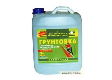 Наименование: грунтовка глубокого проникновения, акриловая, Производитель: Оптимист Страна производитель: Россия Тип: Грунтовки акриловые Назначение: Бесцветная акриловая грунтовка с высокой проникающей способностью и отличными поверхностно-скрепляющими свойствами. Изготовлена из специально подобранных латексов, обладающих высокой проникающей способностью, способствует увеличению адгезии. Глубина проникновения составляет от 1 до 5 мм и зависит от впитывающей способности основания. Рекомендация по применению: Наносится кистью, валиком или распылителем на сухую, предварительно очищенную от пыли, грязи, масел поверхность. В большинстве случаев достаточно нанести один слой. При сильно впитывающих поверхностях рекомендуется нанесение в два слоя. Время полного высыхания: 1 час. Расход: 100-250 мл/м.кв. в зависимости от впитывающей способности основания. Хранение: Хранить в плотно закрытой таре при температуре от +5°С до +30°С. Гарантийный срок хранения. 1 год со дня изготовления. Меры предосторожности: Грунтовка пожаро- и взрывобезопасна. При попадании в глаза необходимо сразу же промыть их большим количеством воды. Фасовка: 1л, 5л, 10л, 50л, 150л при заказе от 30 тысяч рублей - 100% предоплата. Есть доставка.