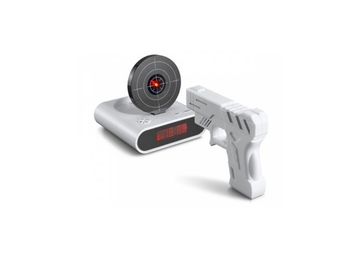 Прекрасный подарок тем, кому тяжело встать с постели утром. При включении сигнала, поднимается мишень, и будильник не выключится до тех пор, пока вы не попадете в мишень из специального пистолета.