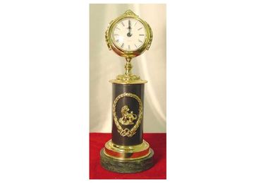 Часы «Подарочные» интересны формой корпуса, увенчанного пальметкой, расположенного на подставке в виде черного цилиндра, обрамленного шлифованной бронзой. В оформлении используется поделочный камень и накладки с разнообразной тематикой. Строгость и изысканность цветовой гаммы, современный дизайн в сочетании с благородным блеском бронзы или латуни, делает их неповторимым подарком. None
