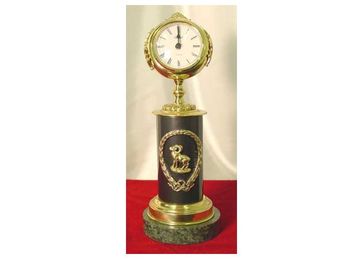 Часы «Подарочные» интересны формой корпуса, увенчанного пальметкой, расположенного на подставке в виде черного цилиндра, обрамленного шлифованной бронзой. В оформлении используется поделочный камень и накладки с разнообразной тематикой. Строгость и изысканность цветовой гаммы, современный дизайн в сочетаниис благородным блеском бронзы или латуни, делает их неповторимым подарком. None