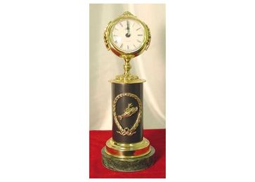 Часы «Подарочные» интересны формой корпуса, увенчанного пальметкой, расположенного на подставке в виде черного цилиндра, обрамленного шлифованной бронзой. В оформлении используется поделочный камень и накладки с разнообразной тематикой. Строгость и изысканность цветовой гаммы, современный дизайн в сочетании с благородным блеском бронзы или латуни, делает их неповторимым подарком. None
